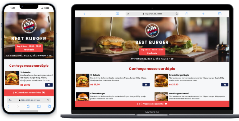 Best Burger | App de Delivery 🍔 Projeto front-end focado em performance e usabilidade. Desenvolvido com HTML5, Tailwind CSS e JavaScript, o app simula a jornada real de compra em uma hamburgueria, desde a seleção de produtos via API o fechamento do pedido, Até o endereço para entrega.
